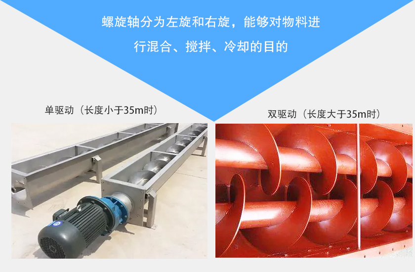 絞龍螺旋輸送機是利用旋轉的螺旋將被輸送的物料沿固定的機殼內推移而進行輸送工作,頭部及尾部軸承移至殼體外,吊軸承采用滑動軸承設有防塵密封裝置,軸瓦一般采用粉末冶金,輸送水泥采用毛氈軸瓦,吊軸和螺旋軸采用滑塊連接。