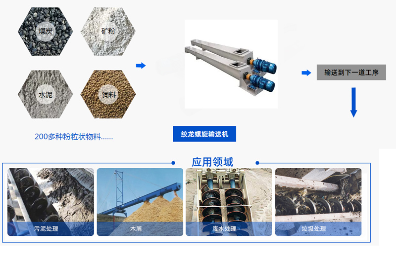 絞龍螺旋輸送機通常水平或略微傾斜使用,作為輸送半固體材料的有效方式,包括飼料、糧食、面粉、玉米、大豆、垃圾、木屑、骨料、污泥、固體廢物等,每小時輸送量在1.4-458立方米,輸送長度可達70米。