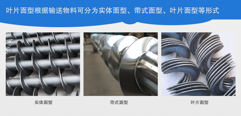 絞龍螺旋輸送機旋轉軸上焊有螺旋葉片,葉片面型根據輸送物料可分為實體面型、帶式面型、葉片面型等形式。