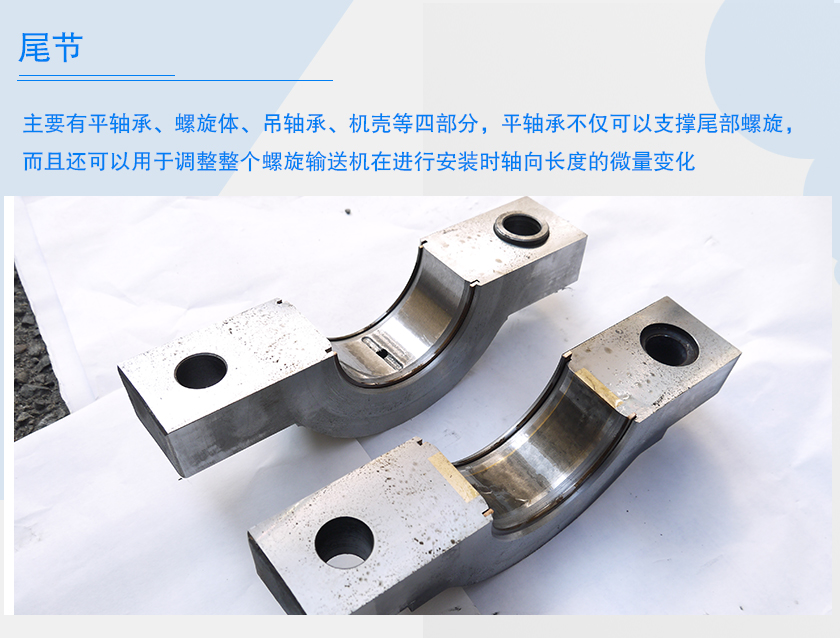 尾節(jié):主要有平軸承、螺旋體、吊軸承、機(jī)殼等四部分,平軸承不僅可以支撐尾部螺旋,而且還可以用于調(diào)整整個(gè)螺旋輸送機(jī)在進(jìn)行安裝時(shí)軸向長度的微量變化。