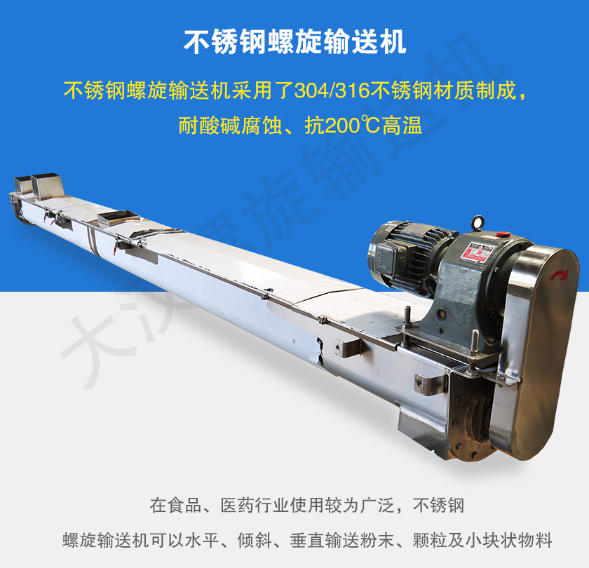 不銹鋼螺旋輸送機(jī)采用了304/316不銹鋼材質(zhì)制成,耐酸堿腐蝕、抗200℃高溫、防止機(jī)器生銹而污染到物料,所以在食品、醫(yī)藥行業(yè)使用較為廣泛,不銹鋼螺旋輸送機(jī)可以水平、傾斜、垂直輸送粉末、顆粒及小塊狀物料。