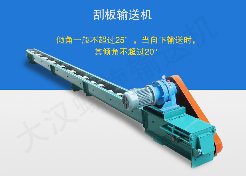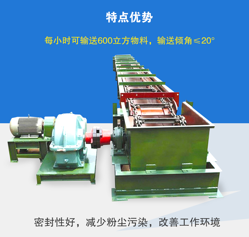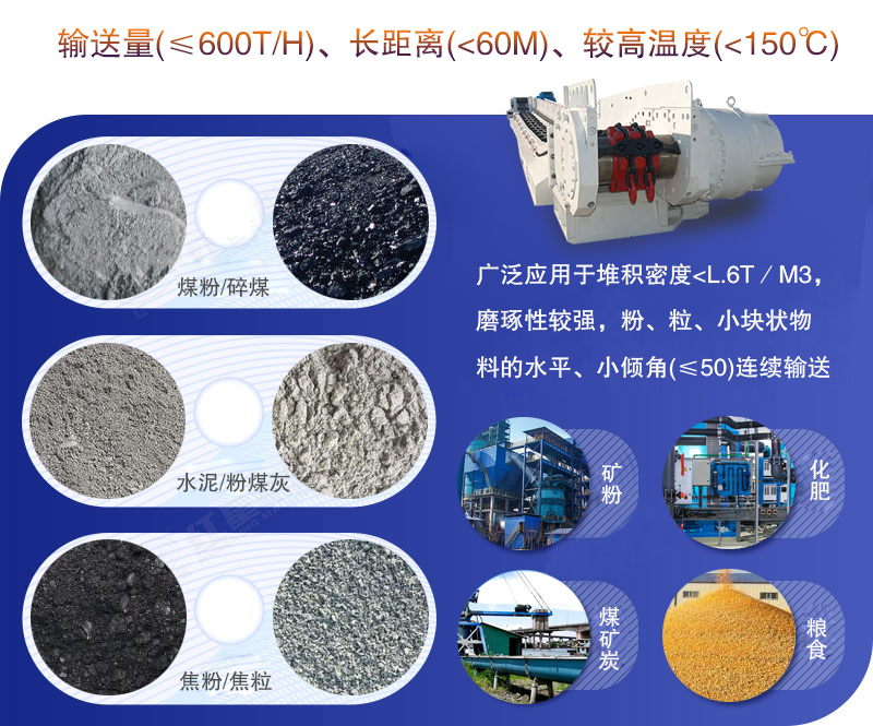 刮板輸送機廣泛應用于堆積密度<l.6t/m3,磨琢性較強,粉、粒、小塊狀物料的水平、小傾角(≤50)連續輸送,如煤粉、碎煤、水泥、粉煤灰、焦粉、焦粒、礦粉、化肥、糧食等大輸送量(≤600t/h)、長距離(<60m)、較高溫度(<150℃)物料的連續輸送。