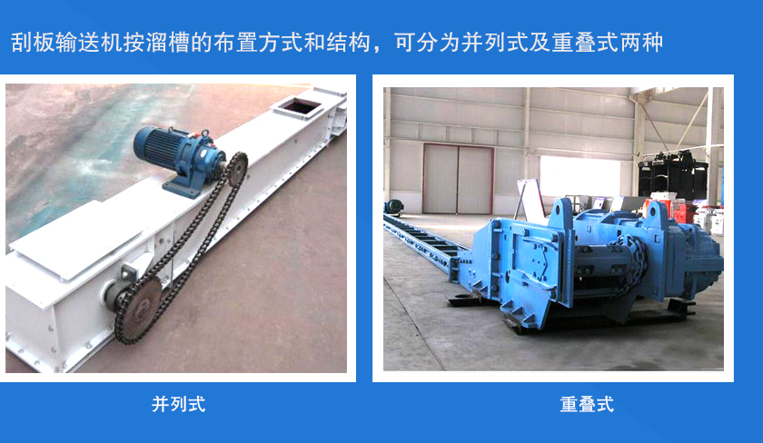 刮板輸送機按溜槽的布置方式和結構,可分為并列式及重疊式兩種,按鏈條數目及布置方式,可分為單鏈、雙邊鏈、雙中心鏈和三鏈4種。