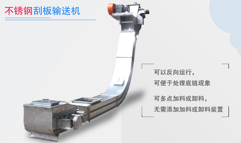 牽引鏈繞過頭、尾鏈輪構成閉合環路,物料可選用上分支或下分支任意輸送,也可用兩分支同時輸送,牽引鏈設計多為圓環鏈較多。采用一根牽引鏈與刮板中部聯接,也可用兩根牽引鏈與刮板兩端聯接,刮板的形狀有梯形、長方形或長條形三種,分固定式和移置式兩種形態。